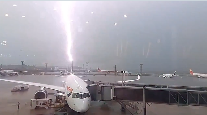Amazing video captures lightning striking a British Airways A350-1041 at Sao Paulo Guarulhos International Airport.