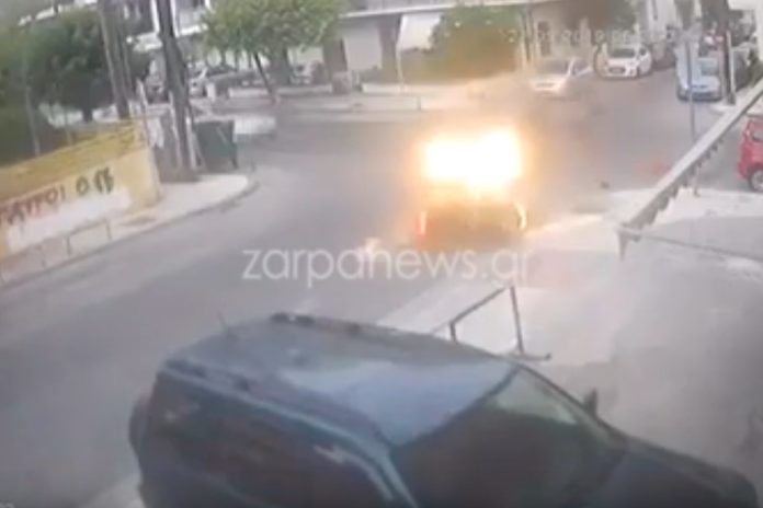 Συγκεκριμένα, όπως φαίνεται και στις εικόνες σοκ, που κατέγραψε καρέ καρέ το κλειστό κύκλωμα κάμερας παρακολούθησης της περιοχής, στο τροχαίο που έγινε στις 06.25 στη συμβολή των οδών Μανουσογιαννάκηδων και Μάρκου Μπότσαρη, αυτοκίνητο συγκρούεται με σφοδρότητα με διερχόμενη μηχανή.