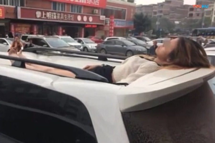Σε video που αναρτήθηκαν σε Κινέζικους ιστότοπους φαίνεται η στιγμή που οι πυροσβέστες απομακρύνουν τη γυναίκα αφού έχει πέσει πάνω στο αυτοκίνητο στην επαρχία Γκουανξί, στη νοτιοδυτική Κίνα. Κινεζικά ΜΜΕ αναφέρουν ότι η γυναίκα ήταν υπό την επήρεια αλκοόλ καθώς έπινε με φίλους της επειδή είχε χωρίσει με τον σύντροφό της.