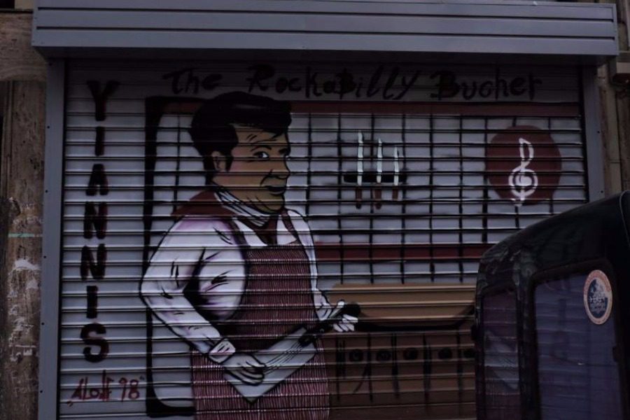 Ο Γιάννης είναι ο ροκ κρεοπώλης της Καλλιδρομίου στα Εξάρχεια που του την έπεσαν οι αντισπισιστές και του σπάσανε το μαγαζί. Επανήλθε δριμύτερος, το έφτιαξε και έβαλε ρολά. Σε αυτά πλέον φαίνεται ένας ροκαμπίλι χασάπης που κρατάει ένα έγχορδο μπαλτά. Απάντησε με χιούμορ και δημιουργικότητα στην καταστροφή.