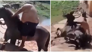 Ο άντρας που τραβάει το βίντεο γελάει καθώς ο αναβάτης πέφτει στο έδαφος, ενώ ο άλλος άντρας τραβάει από τα χαλινάρια το άλογο για να το κάνει να σηκωθεί και να σταθεί στα πόδια του.