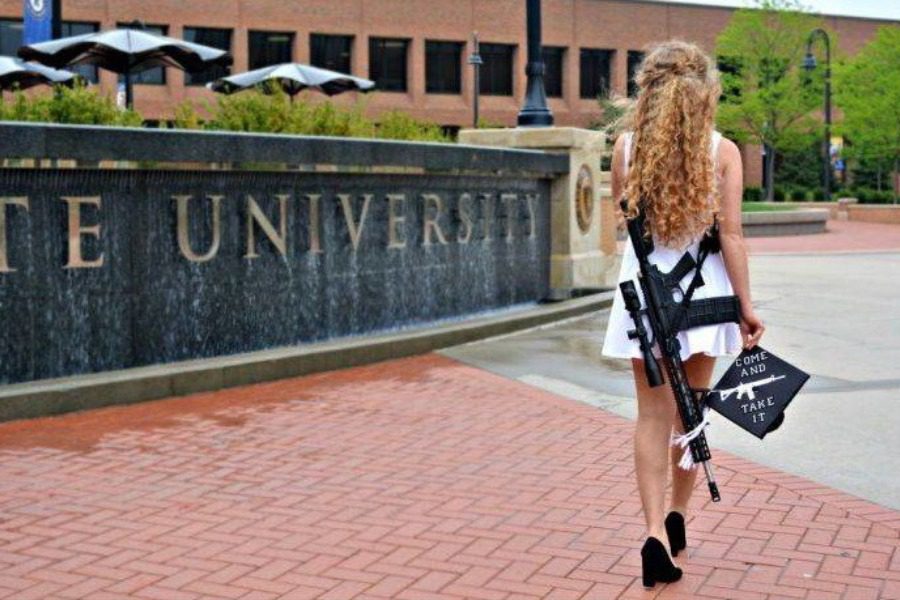 Η 22χρονη Κέιτλιν Μπένετ θέλησε να κάνει μία ισχυρή δήλωση και έτσι πήγε στο χώρο της πανεπιστημιούπολης με ένα ισχυρό ημιαυτόματο όπλο και με μία ταμπέλα, η οποία είχε ένα όπλο σχεδιασμένο πάνω και έγραφε «ελάτε να το πάρετε».