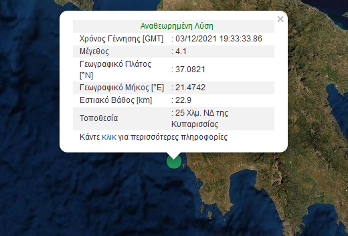 Ο σεισμός έγινε στις 21.33 και σύμφωνα με την αναθεωρημένη λύση του Γεωδυναμικού Ινστιτούτου, το μέγεθος του σεισμού ήταν 4,1 ρίχτερ.