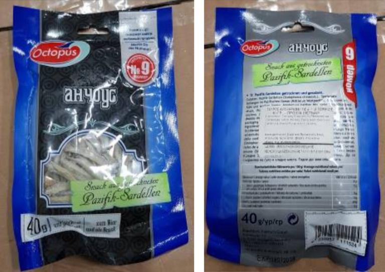 Πρόκειται για το προϊόν με την εμπορική ονομασία “OCTOPUS-Snack aus getrockneten Pazifik-Sardellen”, προέλευσης Βιετνάμ, σε συσκευασία των 40 g, με ανάλωση κατά προτίμηση πριν από 18.07.19.