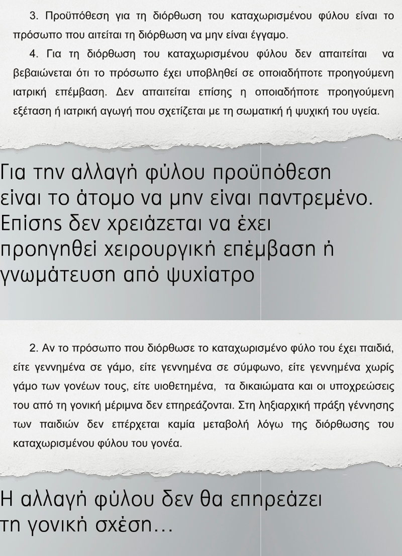 «Για τη διόρθωση του καταχωρημένου φύλου δεν απαιτείται να βεβαιώνεται ότι το πρόσωπο έχει υποβληθεί σε οποιαδήποτε προηγούμενη ιατρική επέμβαση. Δεν απαιτείται επίσης η οποιαδήποτε προηγούμενη εξέταση ή ιατρική αγωγή που σχετίζεται με τη σωματική ή ψυχική του υγεία».