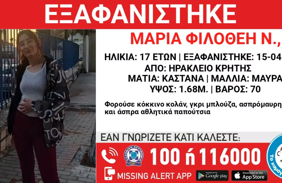 Η 17χρονη Μαρία – Φιλοθέη εξαφανίστηκε την περασμένη Δευτέρα (15/04/2024) από νοσοκομείο στο Ηράκλειο και το Χαμόγελο του Παιδιού προχώρησε στη δημοσιοποίηση των στοιχείων της ανήλικης, κατόπιν εισαγγελικής εντολής, καθώς συντρέχουν λόγοι που θέτουν την ζωή της σε κίνδυνο.