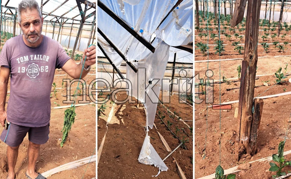 «Το κακό ξεκίνησε εφέτος από τις 10 Σεπτεμβρίου. Όταν ήρθαμε στο θερμοκήπιο μας στην περιοχή μεταξύ των οικισμών του Κεντριού και του Σταυρού, για να φροντίσουμε τις πιπεριές που είχαμε φυτέψει λίγες μέρες νωρίτερα, βρήκαμε έξι πυραμίδες ξηλωμένες με τους ξύλινους στύλους να κρέμονται στον αέρα, μισό μέτρο πάνω από το έδαφος, αλλά χωρίς να έχουν ξεριζωθεί τα φυτά που ήταν μικρά και δεν τα είχαμε δέσει ακόμα στα σύρματα. Με τη βοήθεια των φίλων μας και κάποιων ειδικών συνεργείων, το επισκευάσαμε μέσα σε δύο μέρες και δεν πάθαμε ευτυχώς ζημιά στο φυτικό κεφάλαιο αλλού ούτε και στα πλαστικά κάλυψης που άντεξαν την πίεση. Τότε θυμηθήκαμε ότι το ίδιο φαινόμενο μας είχε χτυπήσει ξανά πριν από 21 χρόνια, την πρώτη χρονιά που είχαμε κατασκευάσει αυτό το ξύλινο θερμοκήπιο.. Τότε μας είχε σκίσει ο ανεμοστρόβιλος μόνο 15 μέτρα πλαστικού οροφής», θυμάται ο κ. Μανόλης Σφυράκης ο οποίος δε μπορεί να πιστέψει ότι εφέτος ο ανεμοστρόβιλος τον «στοχοποιεί» δυο φορές μέσα στο ίδιο δεκαπενθήμερο.