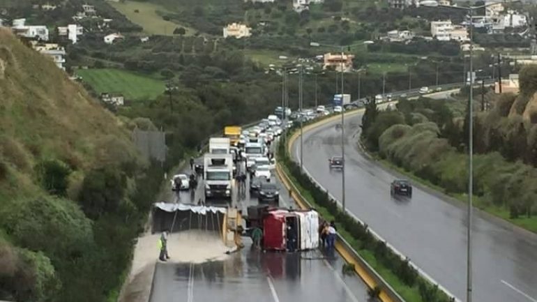 Ατύχημα σημειώθηκε, νωρίς το μεσημέρι, στην Εθνική Οδό στο ύψος της Παπαναστασίου, στο Ηράκλειο, όταν φορτηγό ντελαπάρισε.