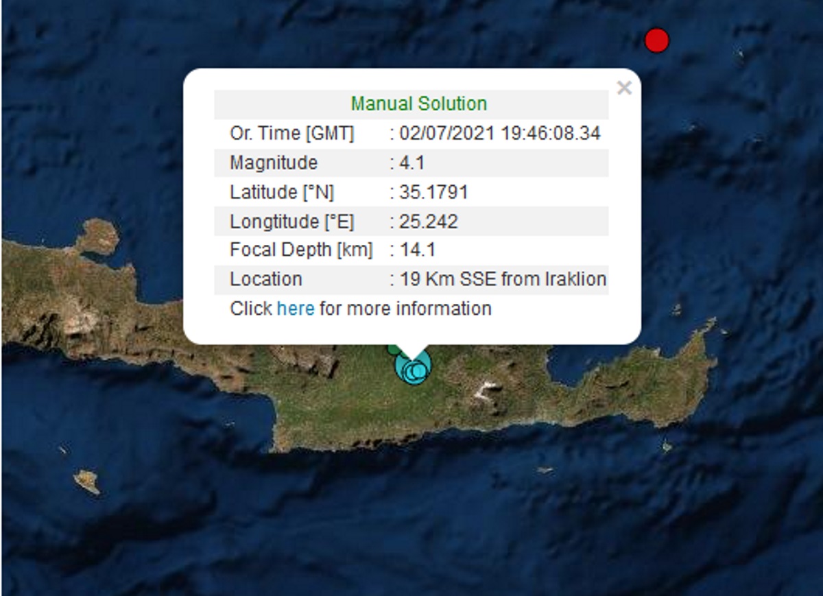 Το εστιακό βάθος του σεισμού ήταν 14,1 χιλιόμετρα και το επίκεντρό του ήταν 19 χιλιόμετρα από το το Ηράκλειο. Πάντως, τον ένιωσαν σε όλα τα νησιά που βρίσκονται κοντά.