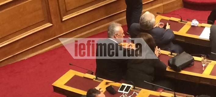 Ο αντιπρόεδρος της κυβέρνησης Γιάννης Δραγασάκης εγκατέλειψε τα υπουργικά έδρανα και πήγε να καθίσει κάτω, δίπλα στη Ντόρα Μπακογιάννη, στα έδρανα της αξιωματικής αντιπολίτευσης.