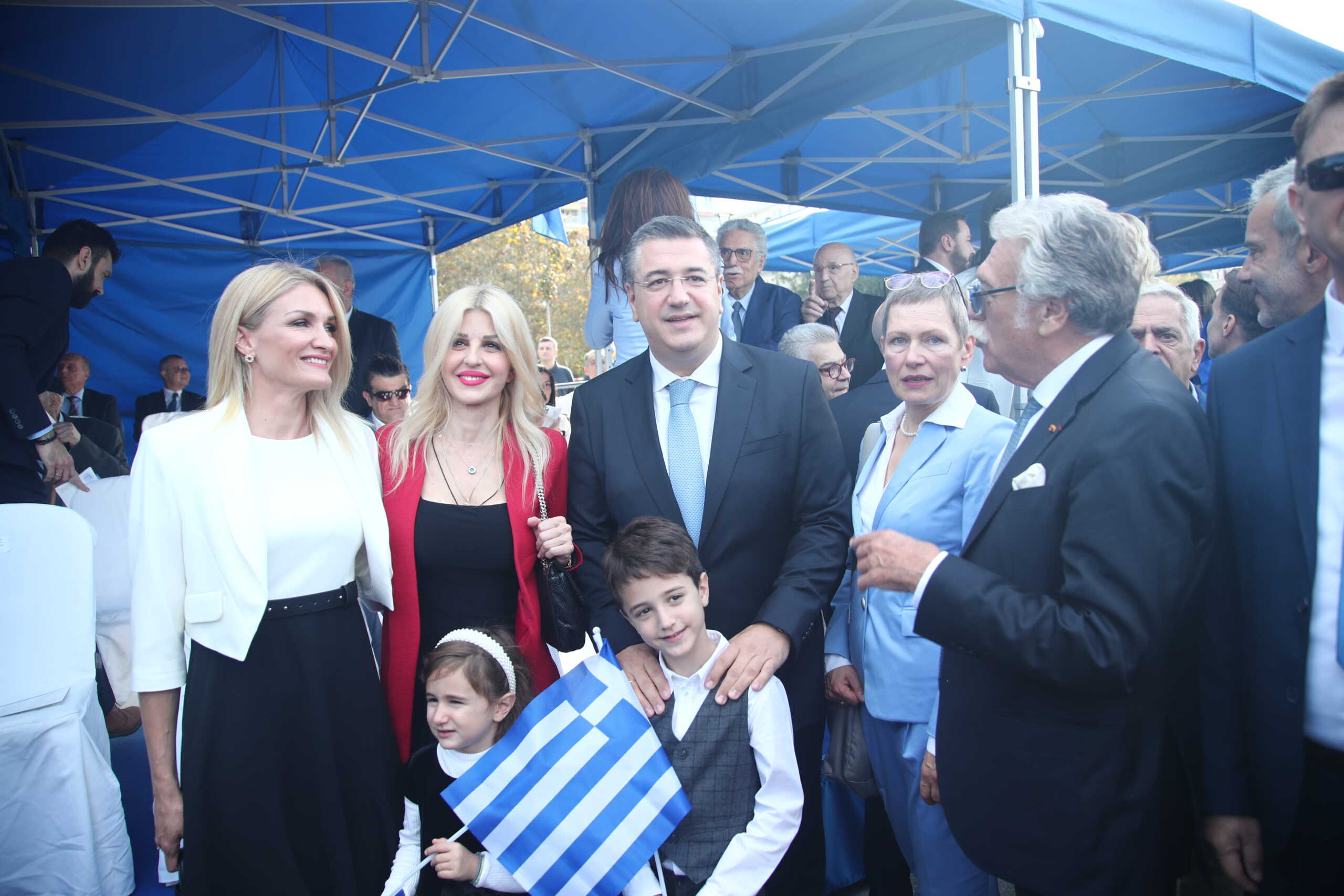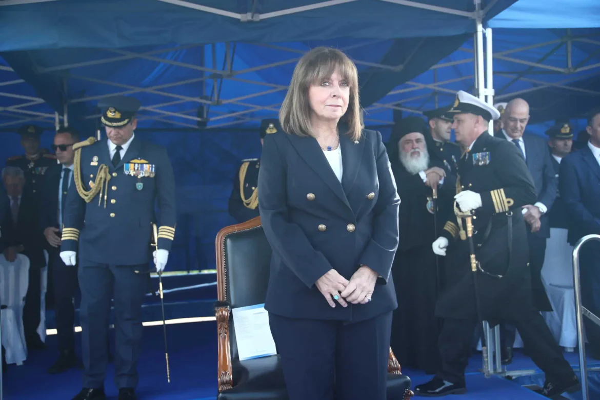 Στην εξέδρα των επισήμων βρίσκεται και ο Υπουργός Άμυνας Νίκος Δένδιας, ο πρόεδρος του ΣΥΡΙΖΑ Στέφανος Κασσελάκης και ο πρόεδρος του ΠΑΣΟΚ Νίκος Ανδρουλάκης.