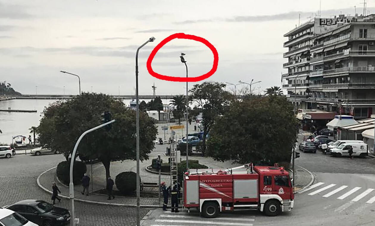 Λίγο μετά τις 11:00 το πρωί, στη μικρή κυκλική πλατεία με το Άγαλμα Μαυρομιχάλη στην παραλιακή της Καβάλας, περαστικοί είδαν έναν γλάρο να έχει «πιάσει» ένα περιστέρι και να το έχει «καρφώσει» στην κορυφή ενός στύλου φωτισμού για να το… φάει με την ησυχία του!