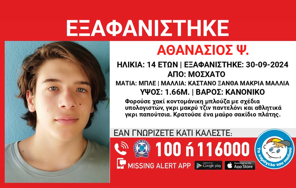 Συναγερμός έχει σημάνει για την εξαφάνιση, στις 30/9/2024, στις 14:00, από τη περιοχή του Μοσχάτου, του Αθανάσιου (Θάνου) Ψ., 14 ετών. Το Χαμόγελο του Παιδιού ενημερώθηκε για την εξαφάνιση του ανήλικου και προχώρησε στη δημοσιοποίηση των στοιχείων του, κατόπιν αιτήματος των οικείων του, καθώς συντρέχουν λόγοι που θέτουν την ζωή του σε κίνδυνο.