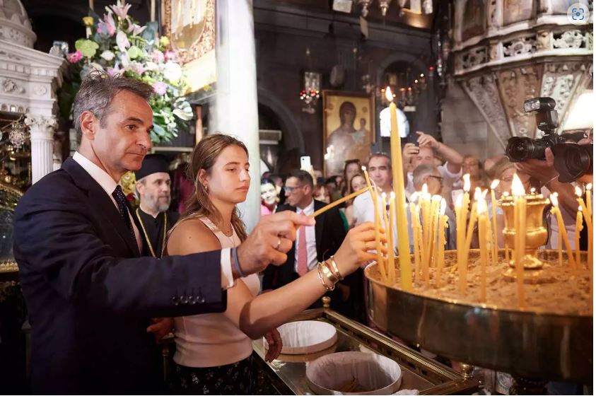 Στην Τήνο μαζί με την κόρη του Δάφνη βρέθηκε ο πρωθυπουργός Κυριάκος Μητσοτάκης για τον εορτασμό Κοιμήσεως της Θεοτόκου.