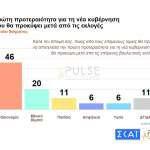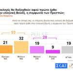 Η ψαλίδα υπέρ της αξιωματικής αντιπολίτευσης ανοίγει στις 10,5 μονάδες με αναγωγή επί των εγκύρων ενώ καταλληλότερος για πρωθυπουργός ο Κυριάκος Μητσοτάκης με 36%.