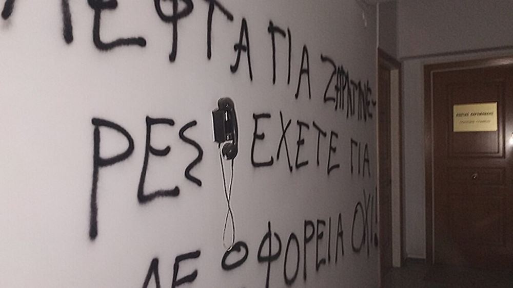 Επίθεση στο πολιτικό γραφείο του υπουργού Υποδομών και Μεταφορών Κώστα Καραμανλή πραγματοποίησαν μέλη του Ρουβίκωνα την Παρασκευή του βράδυ, κατά την οποία έγραψαν συνθήματα στους τοίχους, πέταξαν τρικάκια και αποχώρησαν, πριν φτάσει η αστυνομία στο σημείο.