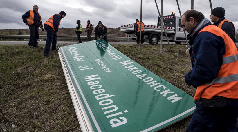 Στις φωτογραφίες του Γαλλικού Πρακτορείου φαίνονται οι εργάτες να «ξηλώνουν» τις πινακίδες με το όνομα «Alexander of Macedonia» («Αλέξανδρος της Μακεδονίας»), προκειμένου να εγκαταστήσουν τις πινακίδες με τη νέα ονομασία, «Λεωφόρος Φιλίας».
