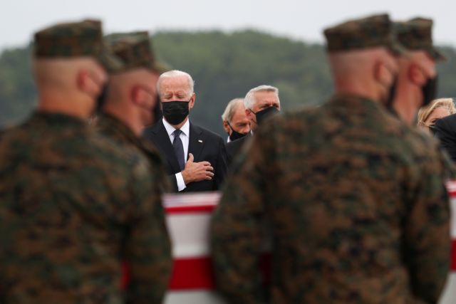 Ο πρόεδρος Τζο Μπάιντεν έκλεισε τα μάτια και έγειρε προς τα πίσω το κεφάλι, καθώς τα φέρετρα, τυλιγμένα με την αμερικανική σημαία, με τις σορούς των 11 Αμερικανών στρατιωτών οι οποίοι σκοτώθηκαν στη βομβιστική επίθεση της περασμένης Πέμπτης στην Καμπούλ, έφτασαν με στρατιωτικό αεροσκάφος στη βάση Ντόβερ του Ντέλαγουερ.
