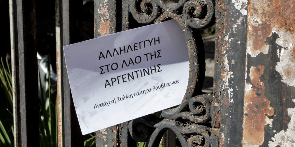 Στις 10:15 το πρωί τα μέλη της αναρχικής συλλογικότητας εισέβαλλαν στην πρεσβεία, πέταξαν φέιγ βολάν, ενώ κρέμασαν και ένα πανό σε απέναντι κτίριο. Τα μέλη του Ρουβίκωνα διαμαρτύρονται για το θάνατο ενός αναρχικού στην Αργεντινή.