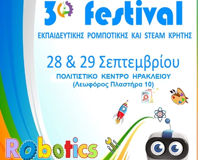 Το Κέντρο Εκπαιδευτικής Ρομποτικής & Επιστημών Κρήτης ROBOTIC & SCIENCE ACADEMY διοργανώνει για 3η συνεχή χρονιά το μεγαλύτερο και μοναδικό ετήσιο Φεστιβάλ Εκπαιδευτικής Ρομποτικής & STEAM στο νησί μας, το οποίο θα λάβει χώρα στις 27, 28 και 29 Σεπτεμβρίου 2019 στο ΠΟΛΙΤΙΣΤΙΚΟ ΚΕΝΤΡΟ ΗΡΑΚΛΕΙΟΥ. Η μεγάλη επιτυχία των προηγούμενων διοργανώσεων το καθιέρωσε στο χώρο και το καθιστά πολλά υποσχόμενο , ώστε το 2019 να αποτελεί ορόσημο για τον θεσμό, πετυχαίνοντας να γίνει το μεγαλύτερο εκπαιδευτικό γεγονός στον Eλλαδικό χώρο στην κατηγορία του.