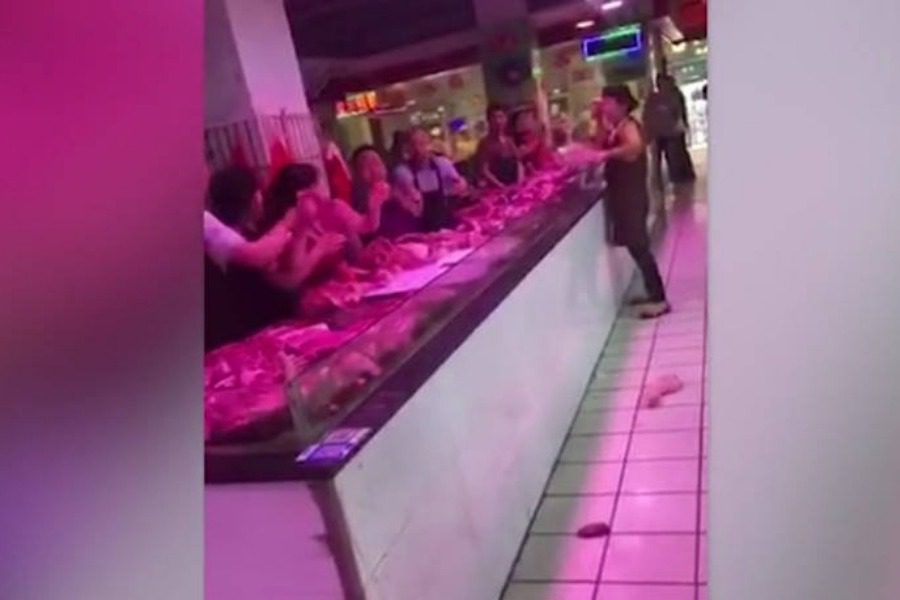 Ό,τι έβρισκαν μπροστά τους πετούσαν οι υπάλληλοι σε μια κρεαταγορά της Σαγκάης και στην προκειμένη περίπτωση εκσφενδονίστηκαν μπριζόλες.