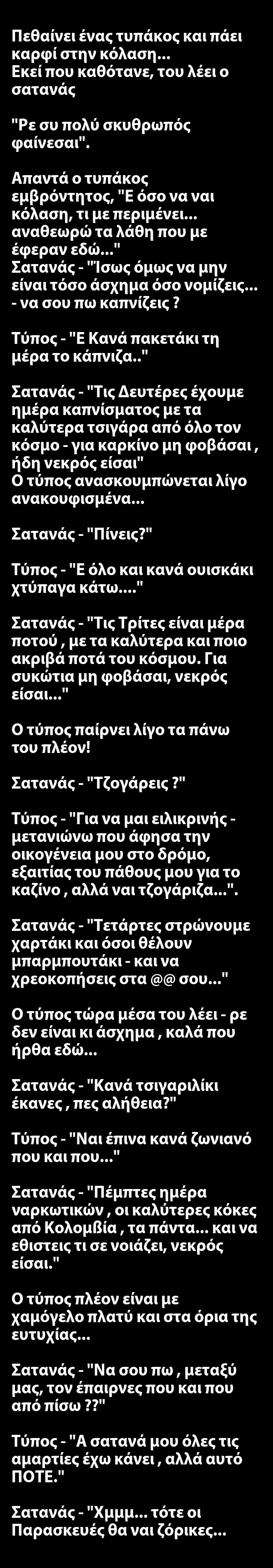 Lifestyle ΑνέκδοταΚΟΡΥΦΑΙΟ! Πεθαίνει ένας τυπάκος και πάει καρφί στην κόλαση… access_time9 έτη πριν www.1069.gr