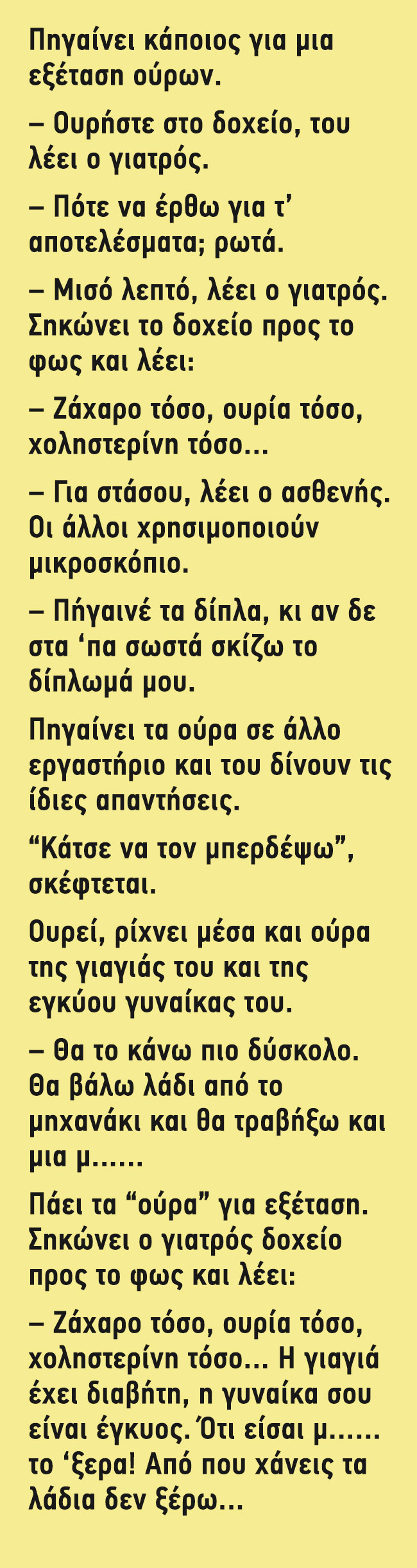 Lifestyle ΑνέκδοταΤο Ανέκδοτό μας: Πηγαίνει κάποιος για μια εξέταση ούρων… access_time9 έτη πριν 1069.gr