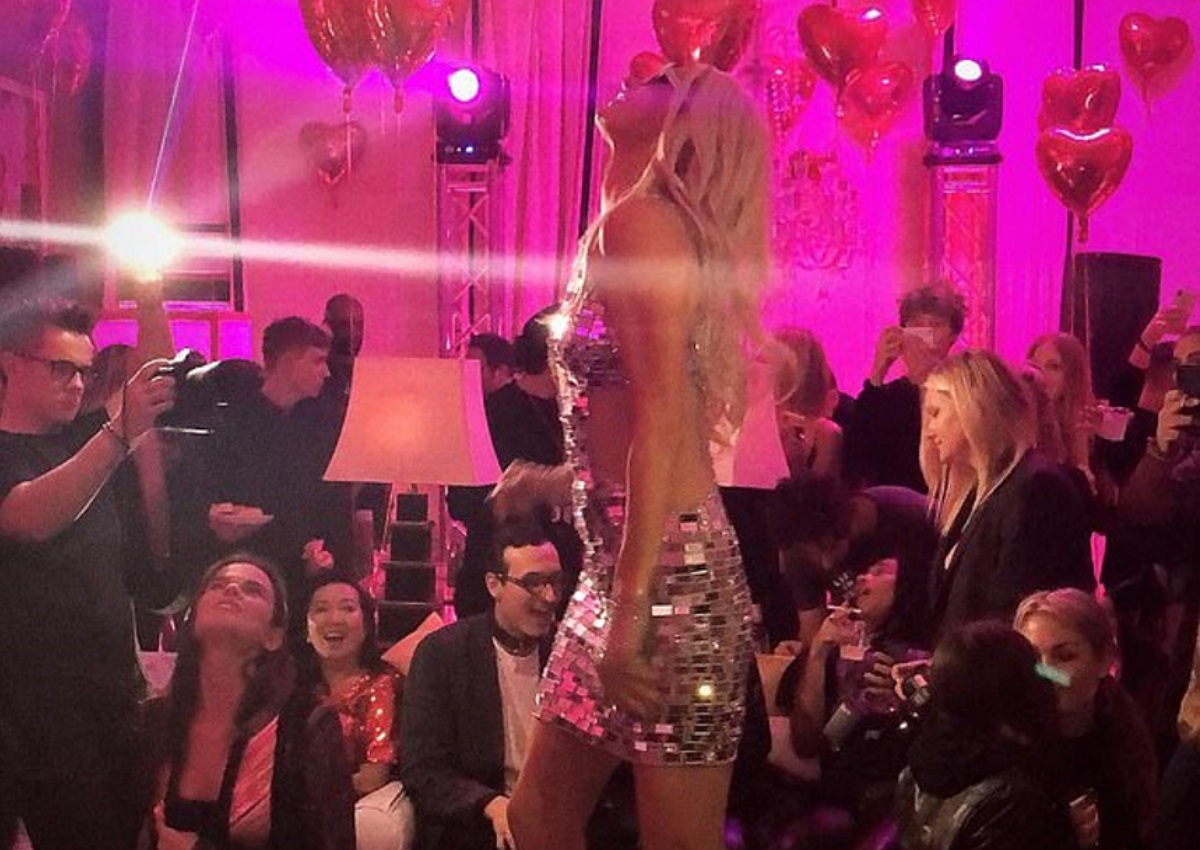 Στο party, όλα ήταν διακοσμημένα τέλεια και με τις προσωπικές πινελιές της κληρονόμου, ενώ η σαμπάνια έρεε άφθονη στα ποτήρια των καλεσμένων. Η τούρτα της Paris, ήταν σε σχήμα καρδιάς (όπως και τα μπαλόνια που είχαν διακοσμήσει τον χώρο) αν και το party ήταν Anti Valentines Day, όπως το ονόμασε η ίδια. Το κέφι βέβαια ξεκίνησε όταν ανέβηκε πάνω σε ένα τραπέζι η Paris και άρχισε να χορεύει ενώ οι καλεσμένοι, την χειροκροτούσαν και της φώναζαν να συνεχίσει. Την ώρα όμως που εκείνη χόρευε με τις ψιλές γυαλιστερές της μπότες, δεν είδε την τούρτα και σκόνταψε επάνω της.