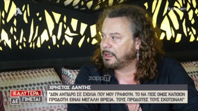 «Αυτή τη στιγμή είμαστε σε μια κοινωνική κατάσταση που υπαγορεύει να δέχεσαι τις ύβρεις. Αυτό είναι φασισμός. Όπως αν στο δρόμο μου δώσει κάποιος ένα χαστούκι, θα δώσω δύο, έτσι απαντάω κιόλας και μετά από πλήρη σκέψη. Καλύτερα να πέσεις στο επίπεδο κάποιου παρά να τον αφήσεις να ανέβει στο δικό σου. Δέχομαι κάθε κριτική, δεν αντιδράω σε σχόλια που μου γράφουν από κάτω. Το να πεις όμως κάποιον προδότη είναι μεγάλη βρισιά. Τους προδότες τους σκότωναν…», είπε μεταξύ άλλων ο Χρήστος Δάντης.
