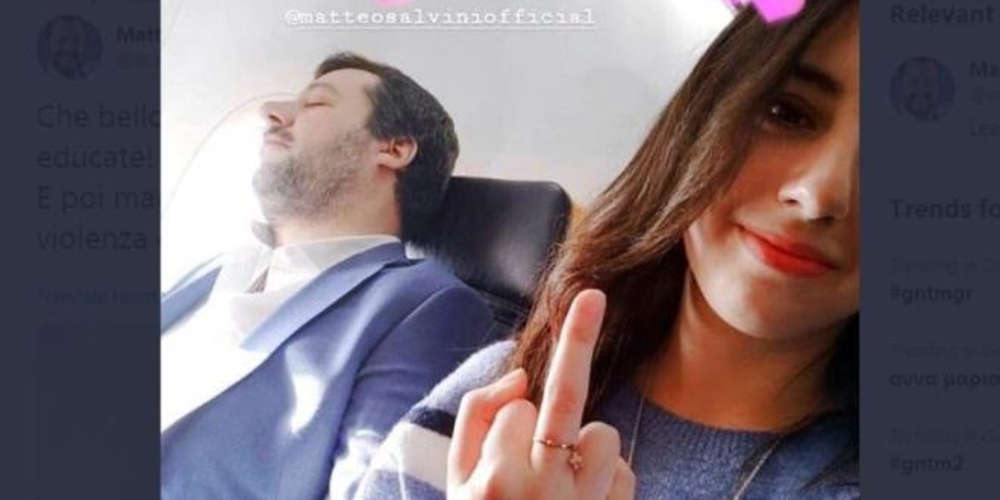 Με οργή σχολίασε ο Σαλβίνι τη φωτογραφία που ανέβασε στα social media η 19χρονη Έρικα Λάμπε, στην οποία υψώνει το μεσαίο δάχτυλό της, ενώ δίπλα της μέσα στο αεροπλάνο κοιμάται ο αρχηγός της Λέγκας και πρώην υπουργός Εσωτερικών της Ιταλίας.