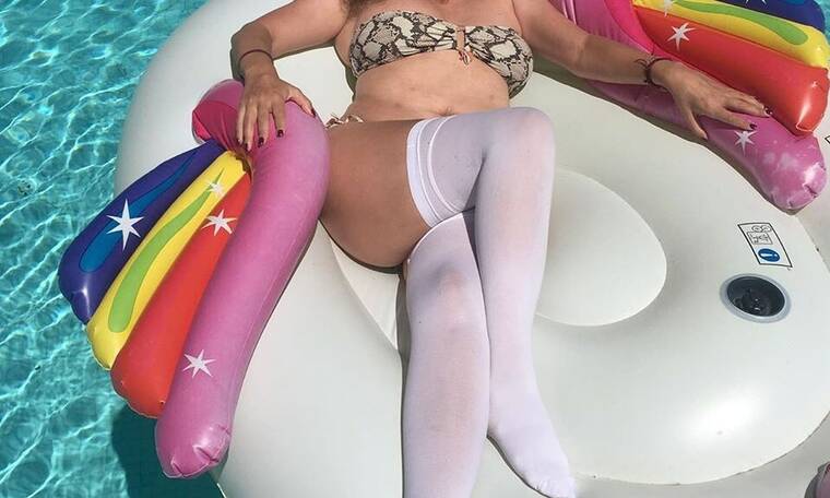 Αυτή τη φορά λοιπόν, πόζαρε πάνω σε ένα φουσκωτό μονόκερο μέσα σε μια πισίνα φορώντας αντιθρομβωτικές κάλτσες.