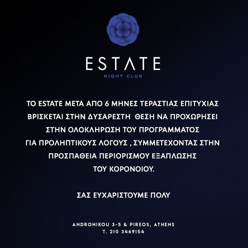 “Το Estate μετά από 6 μήνες τεράστιας επιτυχίας βρίσκεται στη δυσάρεστη θέση να προχωρήσει στην ολοκλήρωση του προγράμματος για προληπτικούς λόγους, συμμετέχοντας στην προσπάθεια περιορισμού εξάπλωσης του κορονοϊού. Σας ευχαριστούμε πολύ”, αναφέρει η ανακοίνωση του γνωστού νυχτερινού μαγαζιού.
