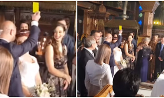 Ωστόσο, η αντίδρασή του θα μείνει για πάντα αξέχαστη τόσο στο ζευγάρι, όσο και τους καλεσμένους. Ο γαμπρός, που είναι πρώην διαιτητής, δεν έχασε την ευκαιρία, και έβγαλε και έδειξε στη νύφη μια κίτρινη κάρτα.Όπως ήταν αναμενόμενο, όλοι, με πρώτη και καλύτερη τη νύφη ξέσπασαν σε γέλια.