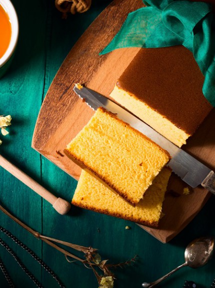 Στρώνετε αντικολλητικό χαρτί ψησίματος σε στενόμακρη φόρμα για κέικ, να καλύπτει τον πάτο και τα τοιχώματα και αδειάζετε μέσα το μίγμα που ετοιμάσατε. Ψήνετε το κέικ στον φούρνο για 10-15 λεπτά, μέχρι να πάρει η επιφάνεια χρυσοκίτρινο χρώμα. Στη συνέχεια το καλύπτεται με ένα κομμάτι αντικολλητικό χαρτί ψησίματος, χαμηλώνετε τη θερμοκρασία στους 170οC και ψήνετε για 40 λεπτά ακόμη. Δοκιμάζετε αν είναι έτοιμο, βυθίζοντας ένα μαχαίρι -θα πρέπει η λάμα του να βγει καθαρή.