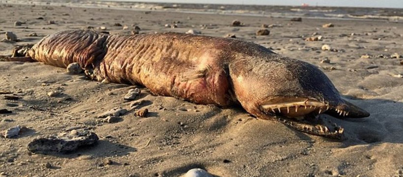 Ένα άγνωστο πλάσμα με μεγάλο στόμα, κοφτερά δόντια και… δίχως μάτια, «ξεβράστηκε» σε παραλία του Τέξας, μετά το σφοδρό χτύπημα του τυφώνα Χάρβεϊ στην περιοχή, πριν από λίγες ημέρες.