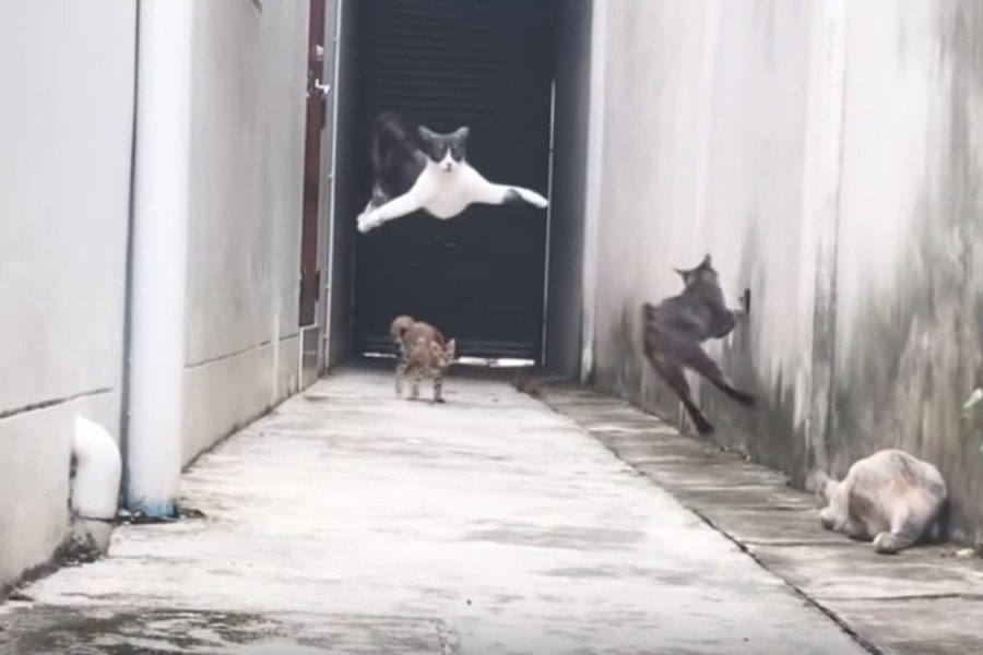Μια εκπληκτική γάτα, μια θεά καλύτερα, μας δείχνει στο παρακάτω βίντεο το ταλέντο της στο παρκούρ, ξεφεύγοντας από «ενέδρα συμμορίας» τριών άλλων γατών.