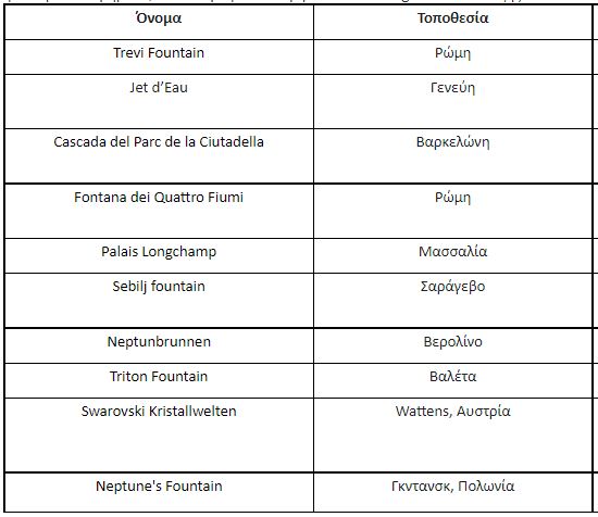 Στην Ευρώπη βρίσκονται τα δέκα συντριβάνια που φιγουράρουν στις 10 πρώτες θέσεις μεταξύ των πιο δημοφιλών στον κόσμο κάτι που πιθανότατα οφείλεται στην κλασική αρχιτεκτονική.