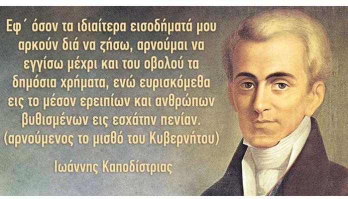 Από τα πιο χαρακτηριστικά παραδείγματα πρωθυπουργού είναι ο Ιωάννης Καποδίστριας. Ο πρώτος κυβερνήτης της χώρας έκανε λιτή ζωή. Παρότι ήταν εύπορος. Μάλιστα, μοίρασε αρκετή από την περιουσία του στις ανάγκες του κράτους και των συμπολιτών του. Αρνήθηκε να λαμβάνει το μισθό του κυβερνήτη, δηλώνοντας ότι τα ιδιαίτερα εισοδήματά του του αρκούν για να ζήσει.