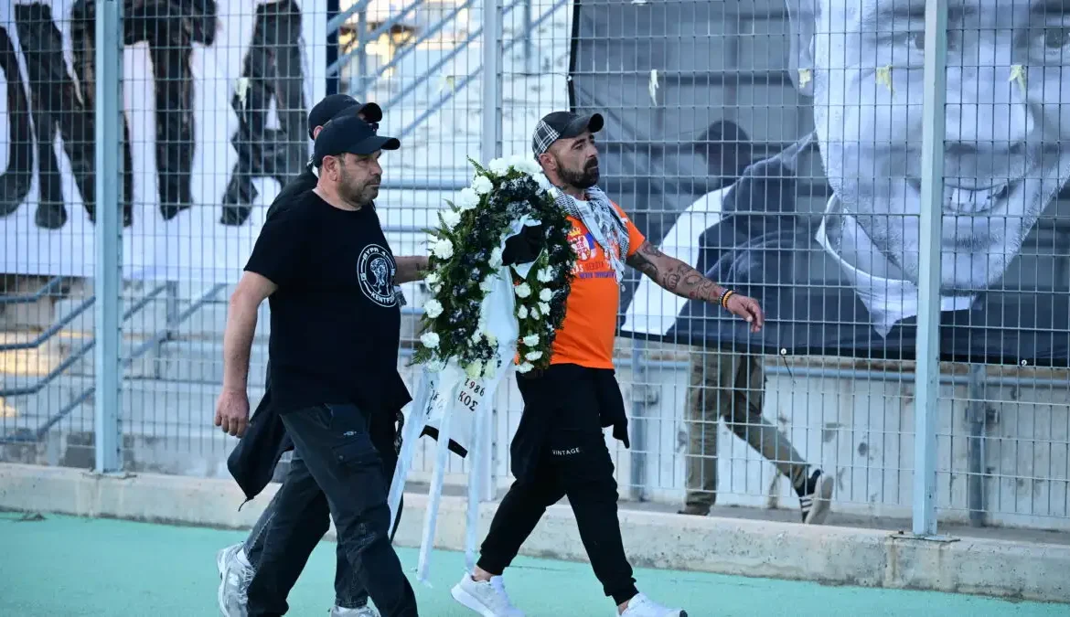 Το σύνθημα “αδέρφια ζείτε εσείς μας οδηγείτε” ήχησε στο Πανθεσσαλικό, όταν φίλοι του ΟΦΗ κατέθεσαν στεφάνια.