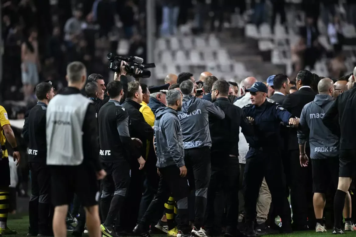 Παίκτες των δύο ομάδων προσπαθούσαν να συγκρατήσουν τον Αργεντινό προπονητή, που ήταν έξαλλος και πιάστηκε στα χέρια με άνθρωπο του ΠΑΟΚ.