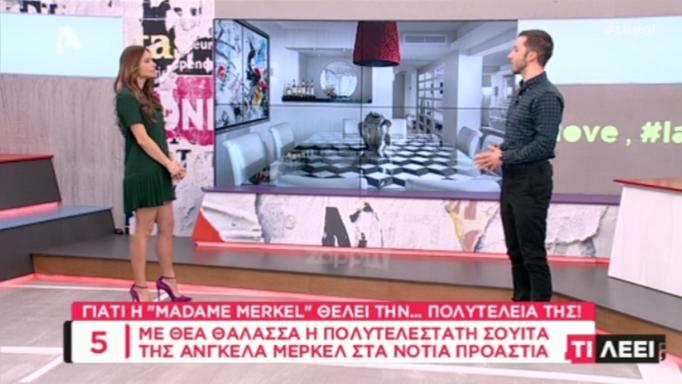 Την πολυτελέστατη σουίτα που θα μείνει η Άνγκελα Μέρκελ κατά την επίσκεψή της στην Ελλάδα παρουσίασαν στην εκπομπή “Τι λέει;”. Πρόκειται για την καλύτερη σουίτα που διαθέτει γνωστό πεντάστερο ξενοδοχείο στη Βουλιαγμένη, έχει θέα όλο τον Σαρωνικό και κοστίζει 5.000 ευρώ τη βραδιά.