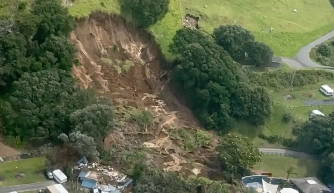 Η κατολίσθηση έπληξε τροχόσπιτα και χώρο καθαριότητας στην κατασκήνωση, στο Βόρειο Νησί, περιοχή όπου σημειώθηκαν ισχυρές βροχοπτώσεις τη νύχτα.