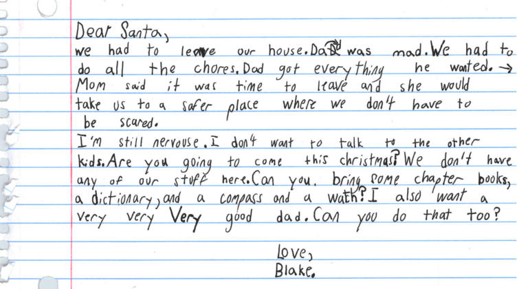 «Αγαπητέ, Άγιε Βασίλη. Έπρεπε να φύγουμε από το σπίτι μας. Ο μπαμπάς ήταν τρελαμένος. Ο μπαμπάς πήρε όλα όσα ήθελε. Η μαμά είπε πως ήταν ώρα να φύγουμε και θα μας πήγαινε σε ένα πιο ασφαλές μέρος όπου δεν θα έπρεπε να φοβόμαστε.