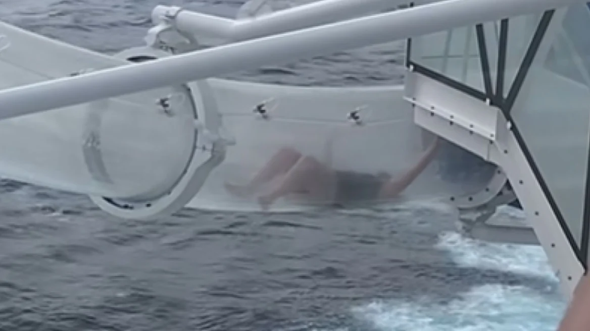 Στιγμές τρόμου έζησε επιβάτης κρουαζιερόπλοιου όταν παγιδεύτηκε μέσα σε νεροτσουλήθρα σε ύψος 30 μέτρων πάνω από την επιφάνεια της θάλασσας, όπως φαίνεται σε βίντεο που έγινε viral στο TikTok.
