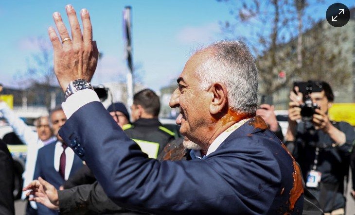 Iran’s exiled Prince Reza Pahlavi was sprayed with a red liquid — reported to be tomato paste or tomato juice — by a protester as he left a press conference in Berlin on Thursday. The suspect was immediately detained by police. pic.twitter.com/Rb6asfqYZ6