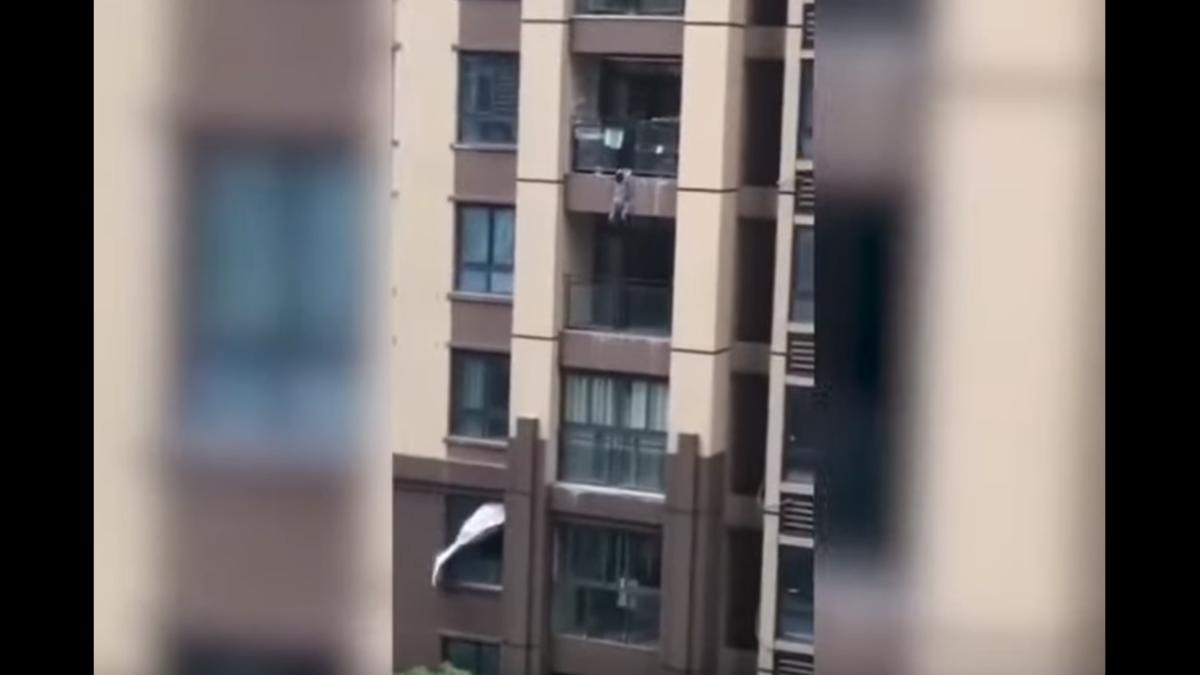 Βίντεο από το περιστατικό δείχνει το παιδί να κρέμεται από το μπαλκόνι της πολυκατοικίας. Προσπαθεί να σκαρφαλώσει για να σωθεί, αλλά τα πόδια του γλιστρούν και αιωρείται στο κενό.