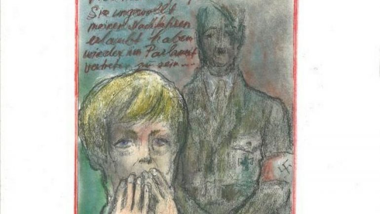 Το σκίτσο, που αναμένεται να δημοσιευθεί το Σάββατο στο ένθετο μηνιαίο περιοδικό της εφημερίδας «Frankfurter Allgemeine Zeitung», σύμφωνα με δημοσίευμα του WWD εμφανίζεται ο Αδόλφος Χίτλερ να λέει στη Μέρκελ: «Σε ευχαριστώ πολύ που επέτρεψες ακούσια στους απογόνους μου να εκπροσωπηθούν στο Κοινοβούλιο». Η Άνγκελα Μέρκελ σε κατάσταση αλλοφροσύνης ρωτά: «Τι έχω κάνει»;