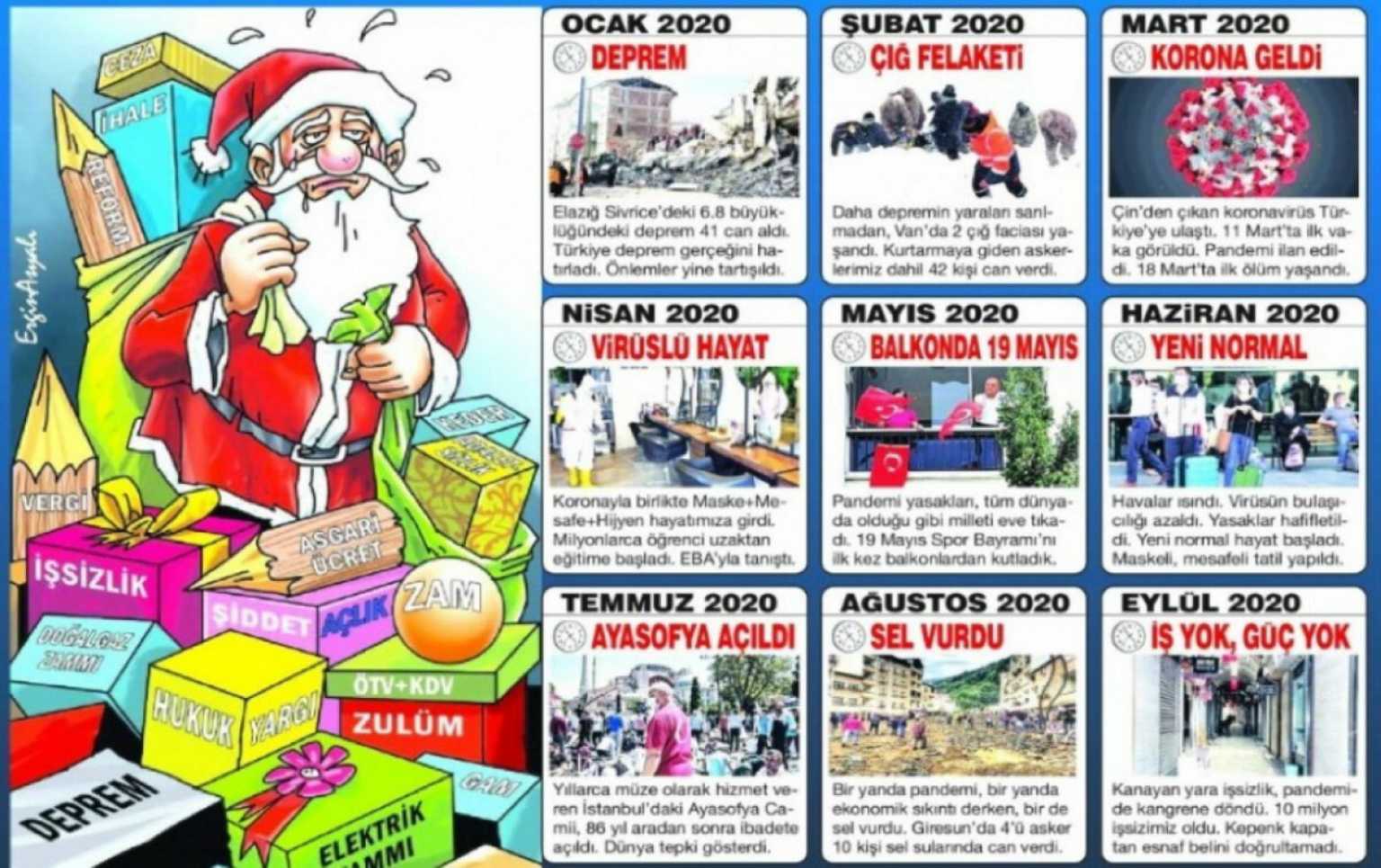 Το πρωτοσέλιδο δείχνει τον Άγιο Βασίλη να κρατά το σάκο του γεμάτο δώρα και έχει τίτλο: Οι καταστροφές και τα δάκρυα που βγήκαν από τον σάκο το 2020″. Δίπλα στον Άγιο Βασίλη παρουσιάζονται 12 γεγονότα που “σημάδεψαν” την Τουρκία και αντιστοιχούν στους 12 μήνες του χρόνου. Για τον Ιούλιο, η εφημερίδα επέλεξε τη μετατροπή της Αγιάς Σοφιάς από μουσείο σε τζαμί, γράφοντας: “Το τζαμί της Αγιάς Σοφιάς στην Κωνσταντινούπολη, το οποίο λειτουργούσε ως μουσείο εδώ και χρόνια, άνοιξε για λατρεία ύστερα από 86 χρόνια. Ο κόσμος αντέδρασε”.