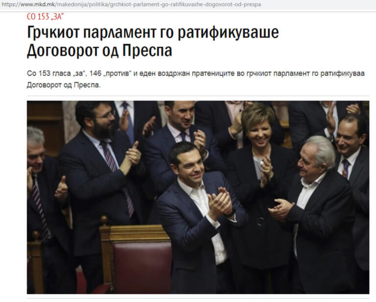 Τα Σκόπια αναφέρουν πως 153 Έλληνες βουλευτές ψήφισαν υπέρ της συμφωνίας ενώ 146 ψήφισαν κατά, και φυσικά σε κάθε ιστοσελίδα η είδηση “φιγουράρει” πρώτη πρώτη.